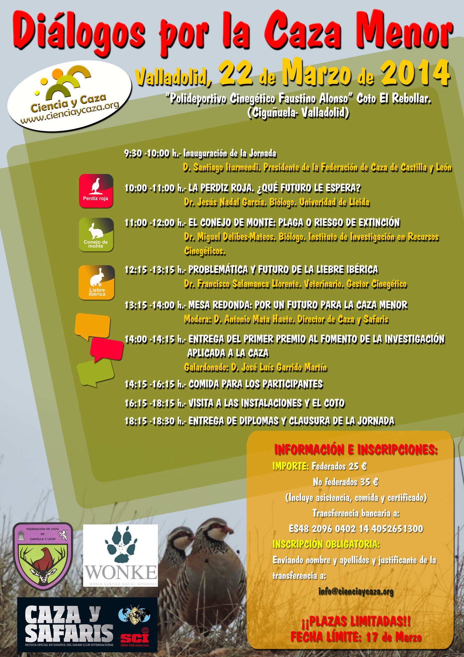 La jornada será inaugurada por Santiago Iturmendi, presidente de la Federación de Caza de Castilla y León, quien dará paso a las ponencias de Jesús Nadal (La perdiz roja, ¿qué futuro le espera?), Miguel Delibes Mateos (El conejo de monte: plaga o riesgo de extinción) y Francisco Salamanca (Problemática y futuro de la liebre ibérica).