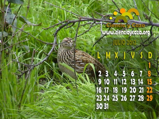 Por todo ello hemos creido oportuno ilustrar el fondo de pantalla calendario correspondiente al mes de julio con una codorniz, a la espera de que pronto podamos divertirnos con su caza.