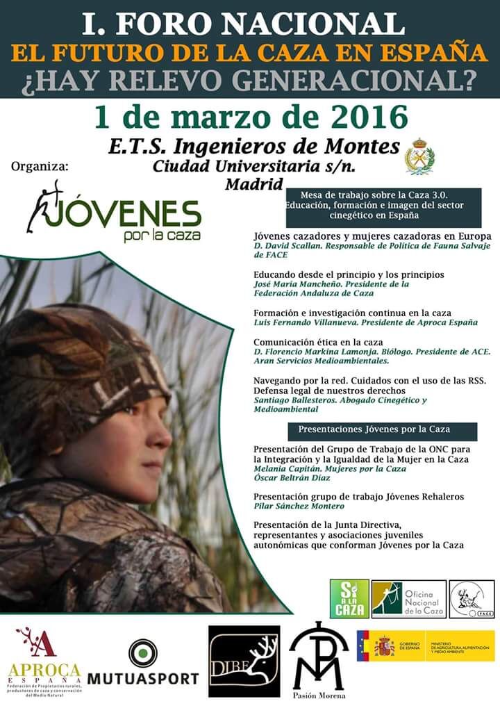 El próximo día 1 de marzo tendrá lugar en Madrid el Primer Foro Nacional sobre el Futuro de la Caza en España y su posible relevo generacional, organizado por Jovenes por la Caza y con el apoyo del Ministerio de Agricultura, Alimentación y Medio Ambiente, la Oficina Nacional de la Caza, Aproca, Mutuasport, Carnicas Dibe y Pasión Morena entre otros.