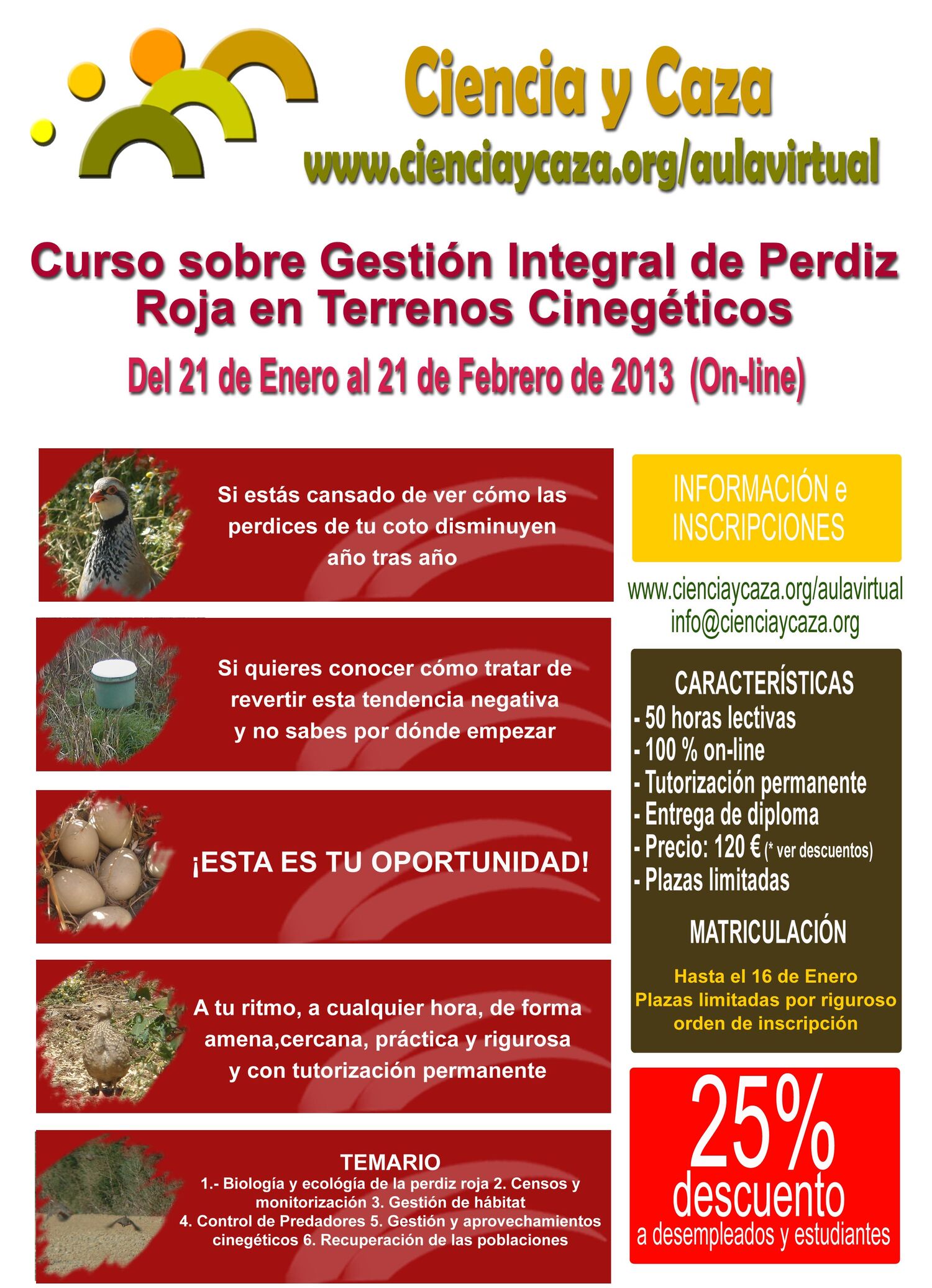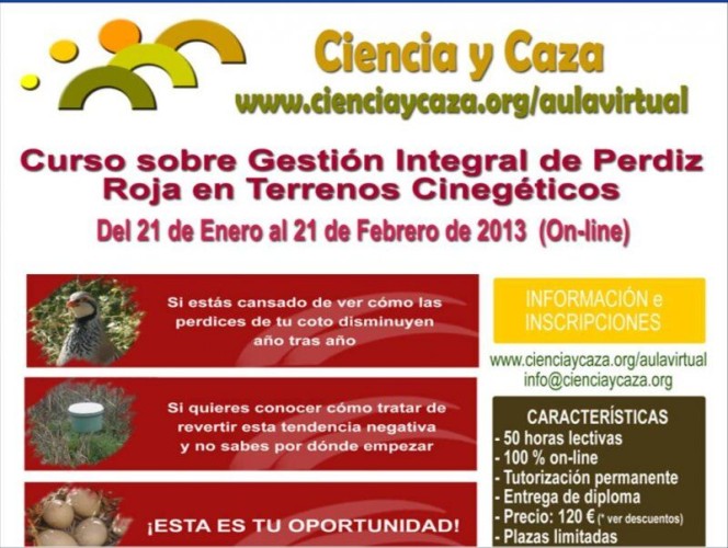 El curso dará comienzo el 21 de Enero de 2013, tendrá una duración de 1 mes, con 50 horas lectivas equivalentes y se impartirá íntegramente on-line a través de nuestro Aula Cinegética Virtual.