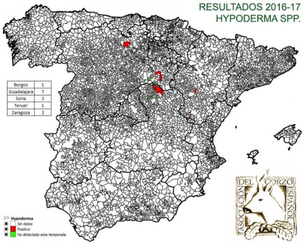 Los datos recopilados, han reportado información de 13 municipios con parasitosis positiva de Hypoderma spp en corzos, con una proporción de 1-4 corzos afectados por localidad.