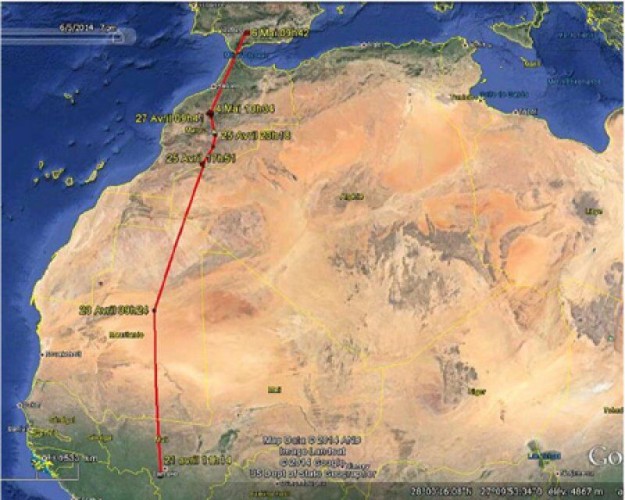 Tras pasar al menos 24 horas en pleno desierto, el 25 de abril llegó a Marruecos, donde hizo una escala hasta el 4 de mayo al norte del Atlas, en la región de Beni Mellal, en una zona de cultivos de regadío.
